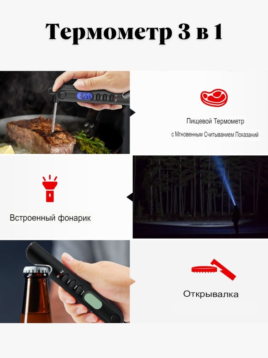 Этот прибор отличается многофункциональностью: помимо термометра, он оснащён открывалкой для пива и светодиодным фонариком. Такое сочетание функций делает его полезным инструментом для любителей барбекю и кулинарии.