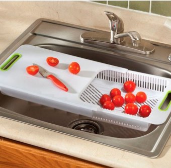 Универсальная разделочная доска подходит для любой ширины мойки благодаря раздвижной конструкции, и представляет собой три полезных кухонных инструмента в одном корпусе: разделочную доску, дуршлаг, контейнер для овощей.