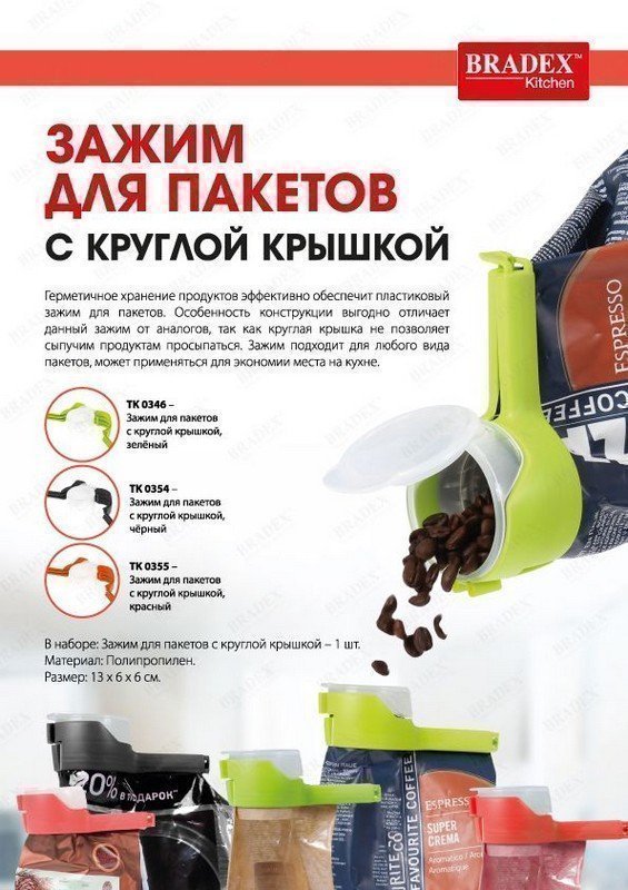 Зажим для пакетов с круглой крышкой позволит герметично хранить сыпучие продукты в пакетах после открытия. Отличается от своих аналогов удобной крышкой, способной дозировать количество извлекаемого продукта. Удобный и простой в использовании он непременно станет надёжным помощником любой хозяйки, так как ваши сыпучие продукты: кофе, чай, сахар, крупы, хлопья, мука и т.д. всегда будут сохраняться сухими. Преимущества: