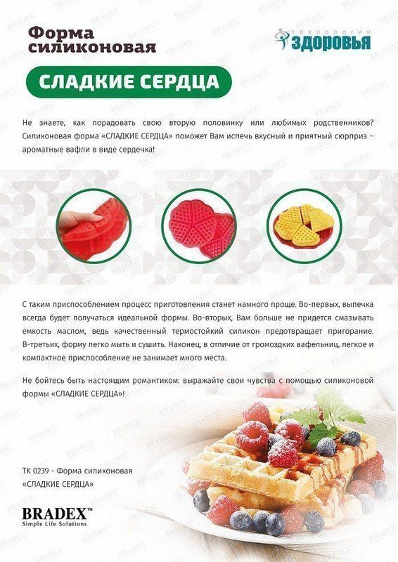 Для бодрящего завтрака или романтического ужина прекрасно подойдут пышные и вкусные вафли. Теперь Вам не потребуется вафельница или иные громоздкие приспособления: все, что Вам нужно, – это духовка и форма силиконовая «СЛАДКИЕ СЕРДЦА». Преимущества: