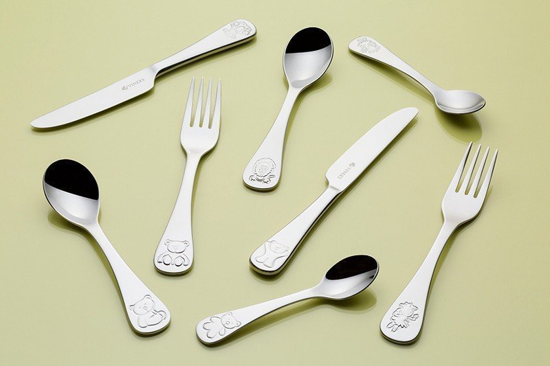 Набор из 4 столовых приборов: нож, вилка, столовая ложка и чайная ложка. Можно мыть в посудомоечной машине. Набор упакован в красивую коробку и станет отличным малышу.