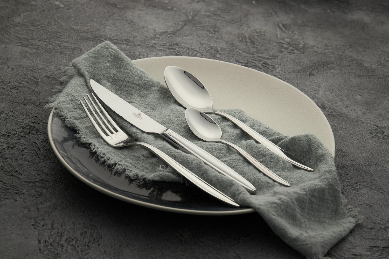 Набор столовых принадлежностей ''Milan'' на 6 персон предназначен для сервировки стола. В комплект входит 24 предмета из высококачественной нержавеющей стали. Не подвержены коррозии, окислению. Практичный и элегантный набор ложек и вилок идеально подходит для оформления праздничного стола и ресторанных банкетов, а так же для повседневного использования. Кухонный набор придется любой хозяйке по вкусу и станет прекрасным подарком на любое торжество. Для привлекательного внешнего вида не рекомендуется протирать посуду твердыми предметами, металлическими губками. При бережной эксплуатации набор столовых принадлежностей прослужит вам очень долго. Приобретайте наши столовые приборы и наслаждайтесь их эстетикой каждый день!