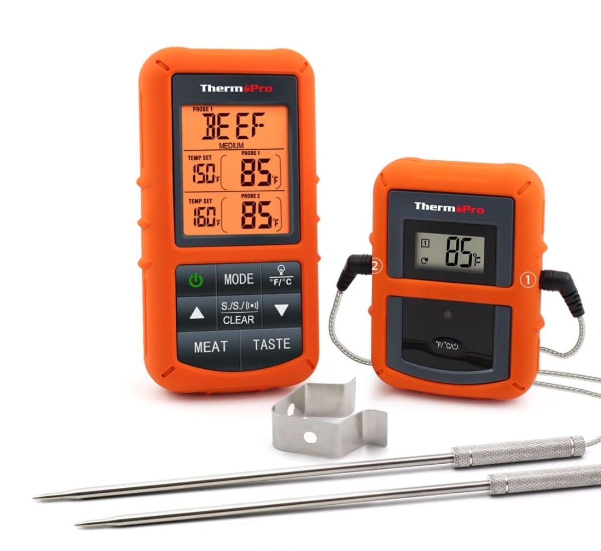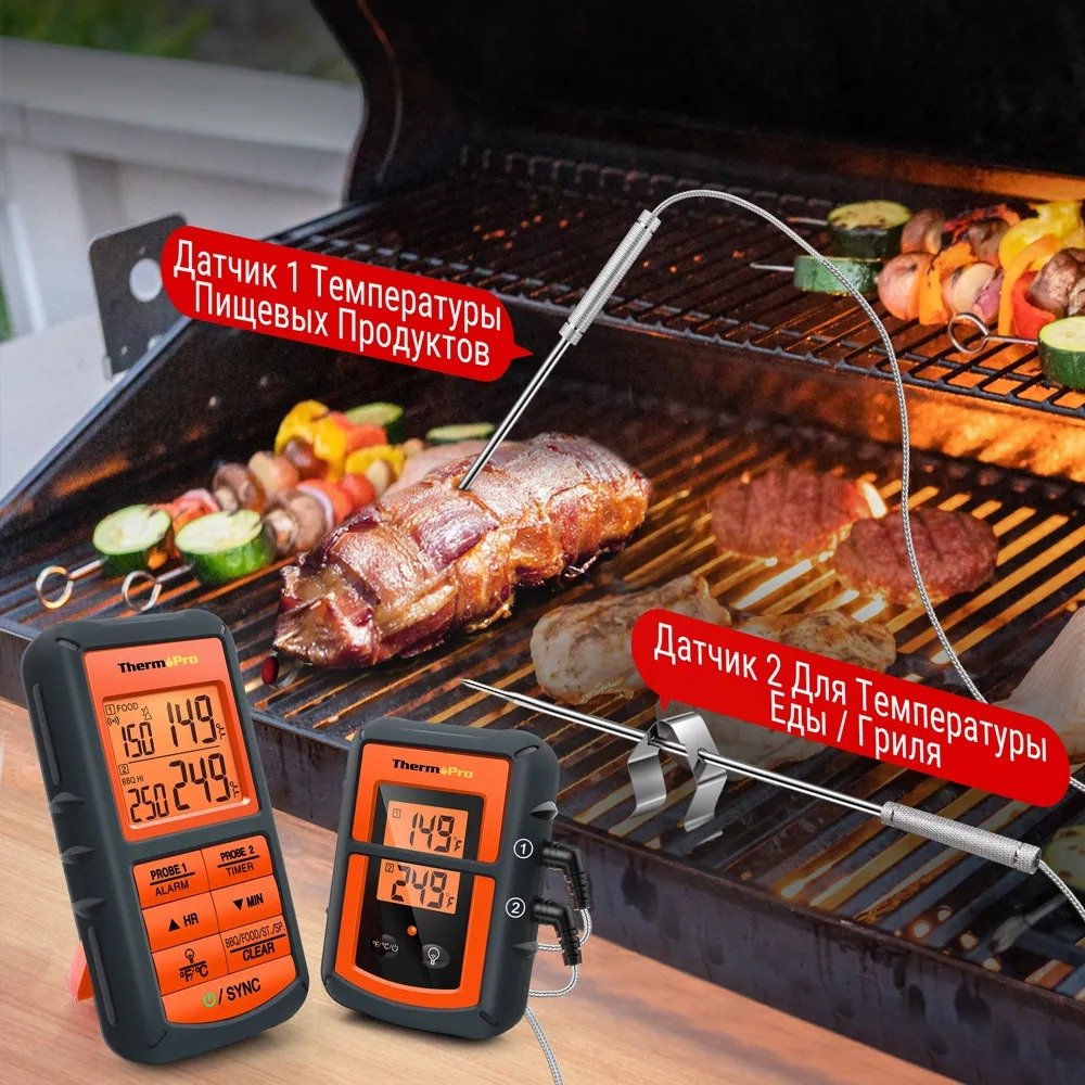 Модель TP-20C цифрового беспроводного термометра фирмы ThermoPro отличается от других моделей данного производителя наличием 2-х отдельных независимо программируемых металлических зондов-датчиков, что позволяет с помощью данного прибора вовремя приготовления двух разных категорий продуктов (например рыба и курица) одновременно контролировать температуру каждого из них.