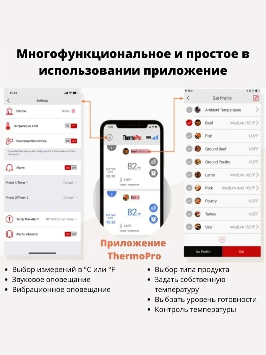 Bluetooth-термометр ThermoPro TP-901 с термощупом — это умный прибор, который поможет приготовить мясо так, чтобы оно было сочным и ароматным. Он станет незаменимым помощником для тех, кто хочет добиться идеального результата при готовке.