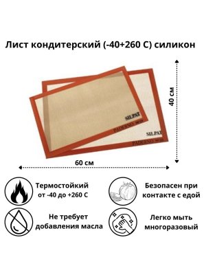 Силиконовый коврик для выпечки подходит для выпекания и заморозки продуктов. Термостойкость, выдерживает температуру от - 40 до +260 градусов. АНТИПРИГАРНЫЙ силиконовый коврик равномерно распределяет тепло по всей поверхности и не даёт продукту пригореть. Подходит для работы с различными видами теста, с мастикой и карамелью. Силиконовый коврик для выпечки в духовке бисквитов, печенья, пряников, хлеба, идеально прилегает к поверхности и НЕ СКОЛЬЗИТ на столе. ЭКОНОМИЧНОСТЬ, не нужны пергаментная бумага для выпечки и масло для смазывания. Лёгкость использования, коврик для кухни силиконовый занимает минимум места в сложенном виде. Легко моется, не впитывает запахи.